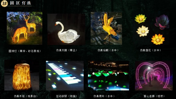 圍繞6大區(qū)塊進(jìn)行景觀(guān)亮化設(shè)計(jì),突出各區(qū)塊的結(jié)構(gòu)特點(diǎn),打造景觀(guān)亮點(diǎn),點(diǎn)亮寧?kù)o的夜空,讓人們?cè)谝雇硪材苄蕾p到美輪美奐的田園風(fēng)光。